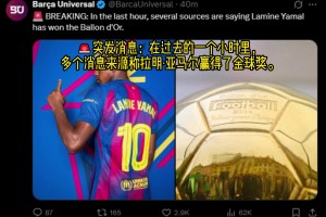 巴萨环球:在过去的一个小时里,多个消息来源称亚马尔赢得金球